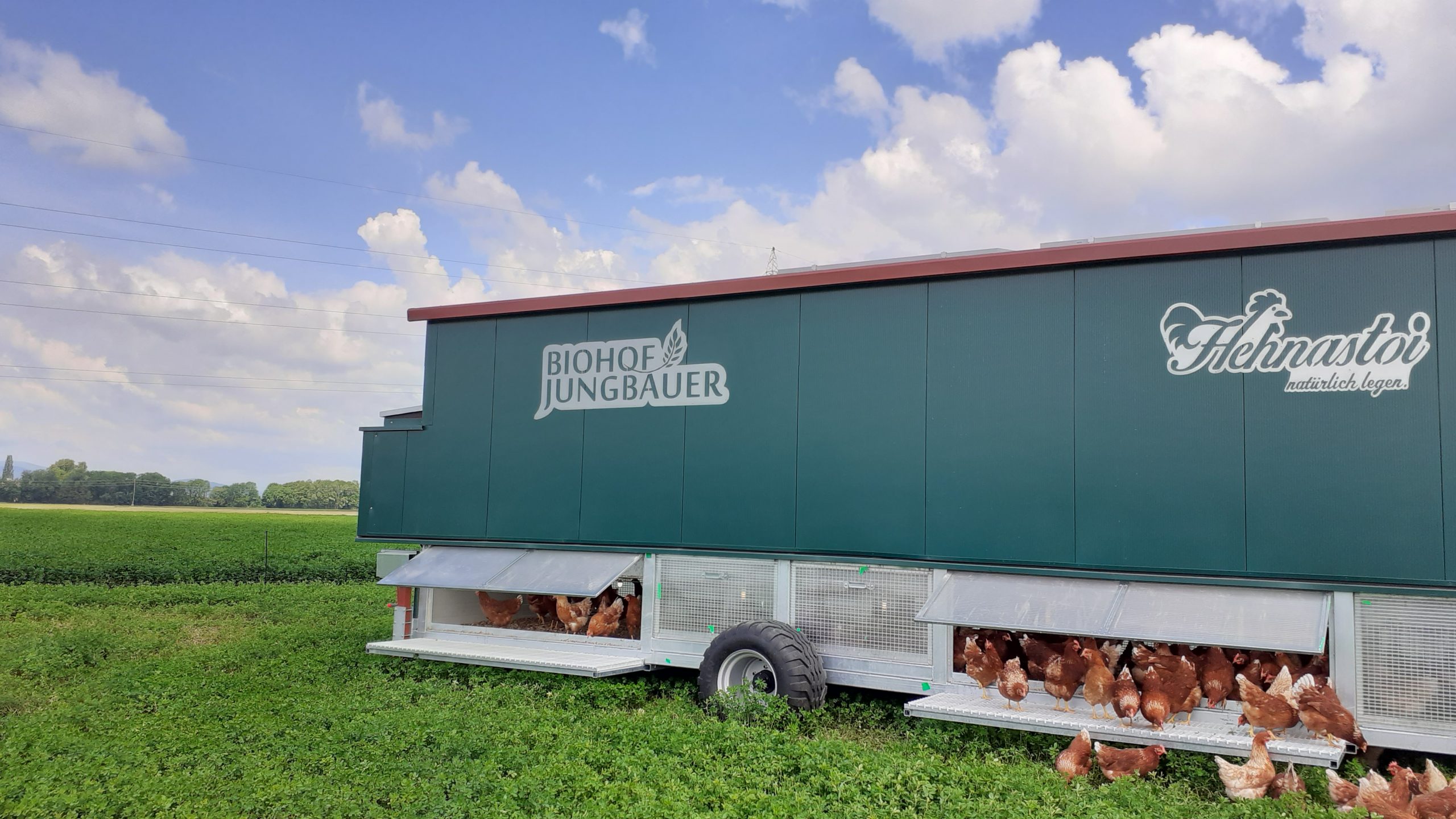 Mit dem Jahr 2021 haben wir auch in einen mobilen Hühnerstall für Bio-Legehennen investiert. Unsere Hühner haben einen großzügigen Auslauf, welcher über die Anforderungen der Bio-Richtlinien hinausgeht. Sie ziehen regelmäßig um, wodurch der Boden geschont wird und sie auch immer frisches Grün zum Picken haben.